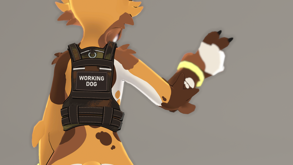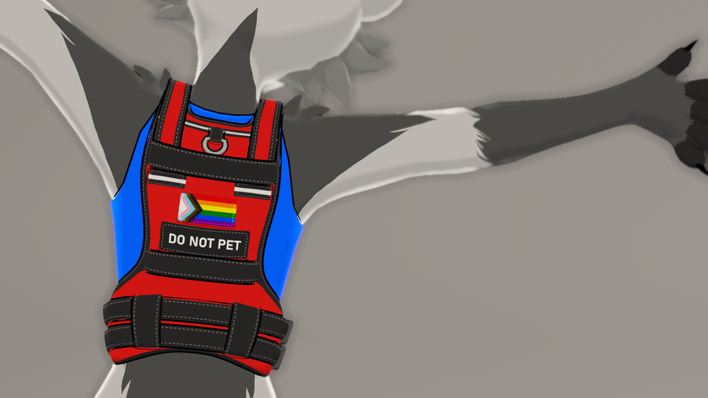 Comes with 2 textures by default, with multiple different labels for the patches available within the SPP file. The two default textures are a standard red therapy dog vest, which can be switched over to a pride flag and "do not touch" on either side. Second is a camo working dog vest which can be switched over to a pride flag and "in training" patch. Also includes Quest variants of these materials.